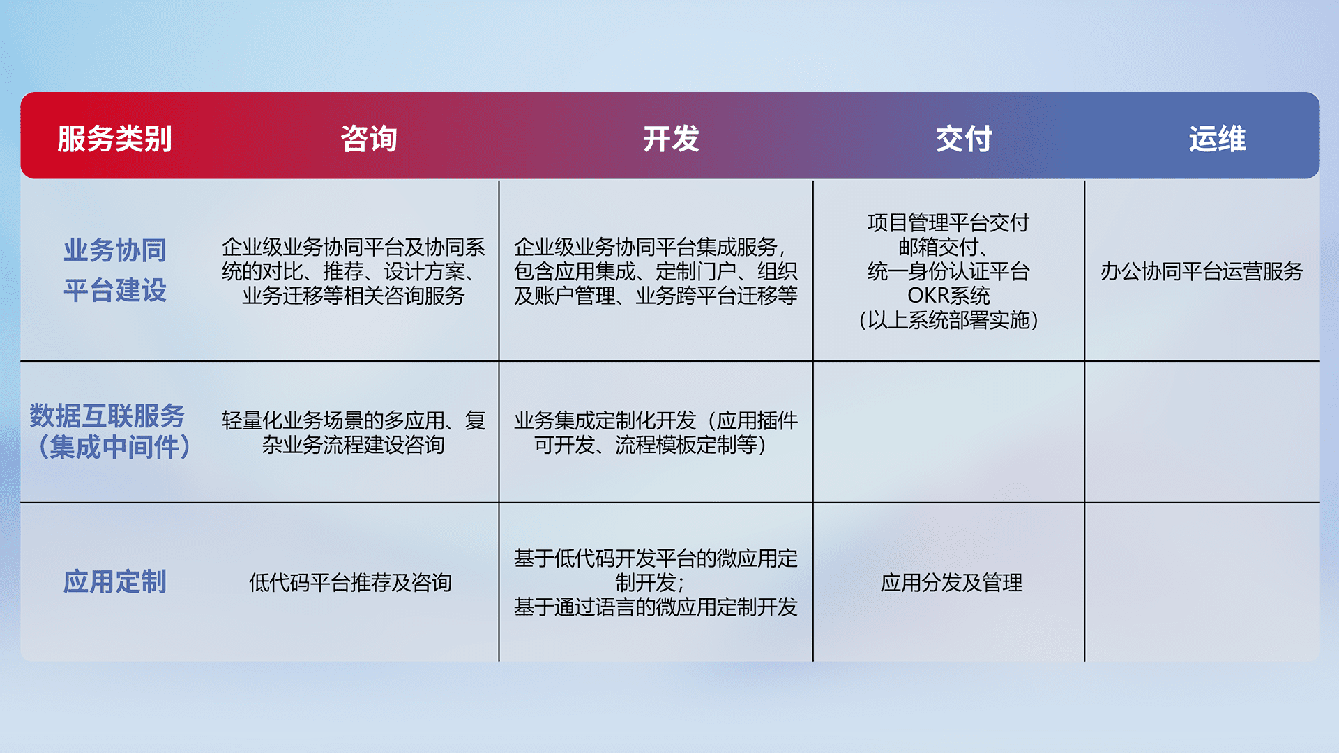 针对钉钉、、、、企微、、、IDaas等平台级产品提供产品的规划、、方案、、、交付、、、、定制化开发等服务,,,实现如统一协同办公、、、智能客户服务、、混合会议管理、、、智能数据查询、、、、等业务场景,,实现数字化转型。。。